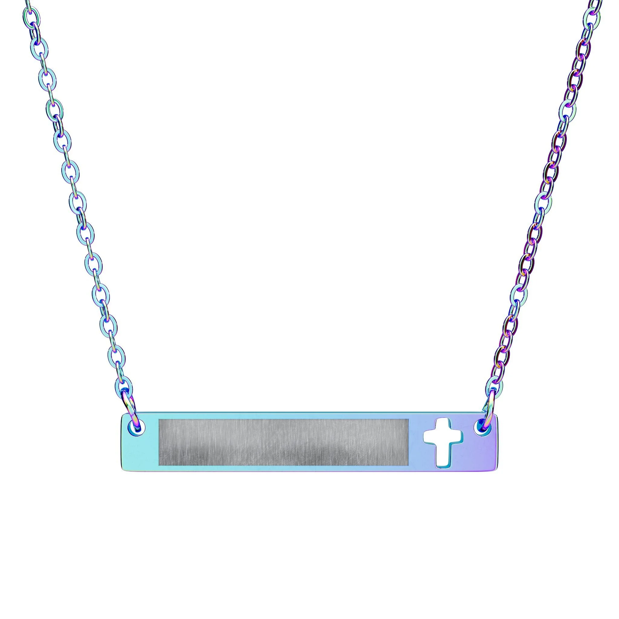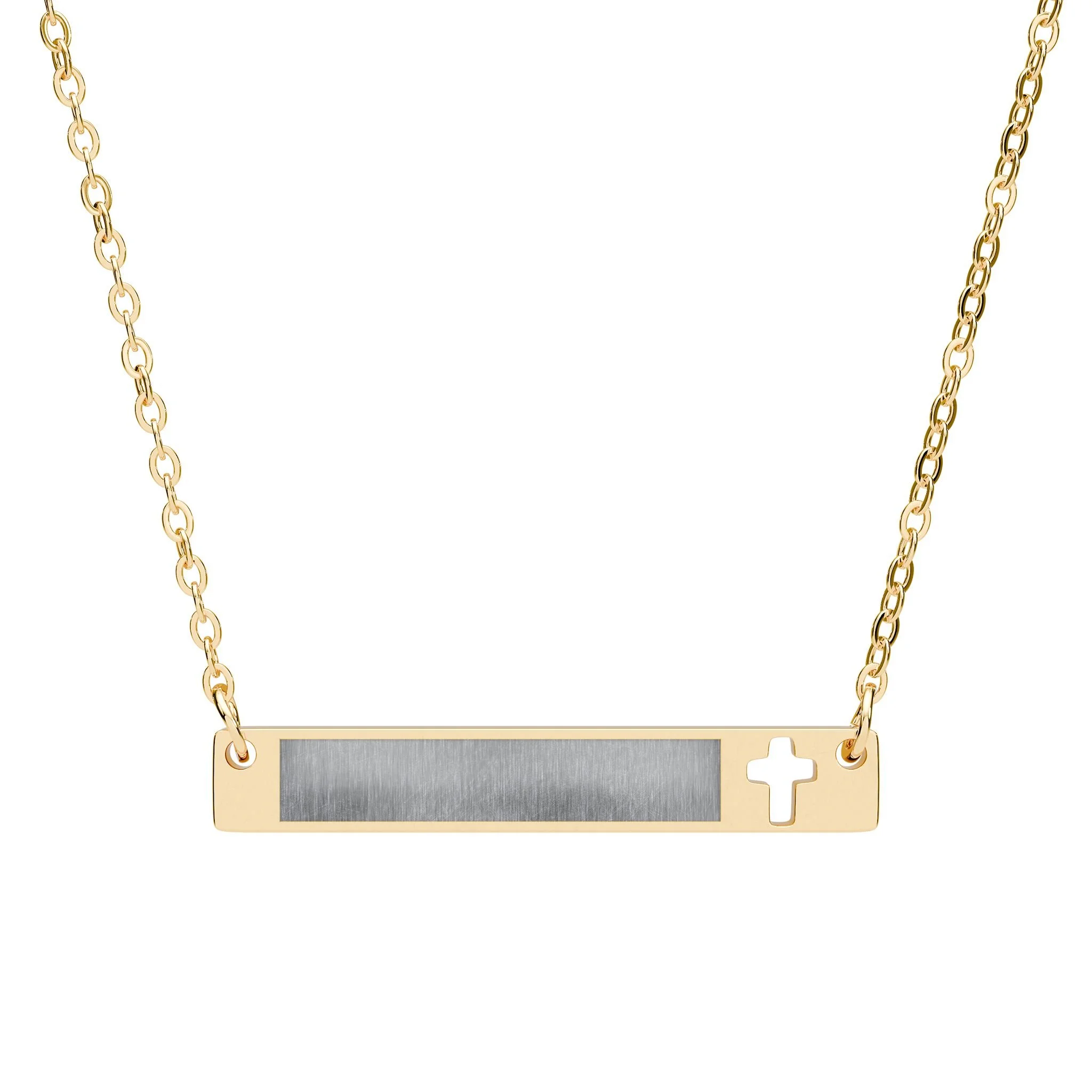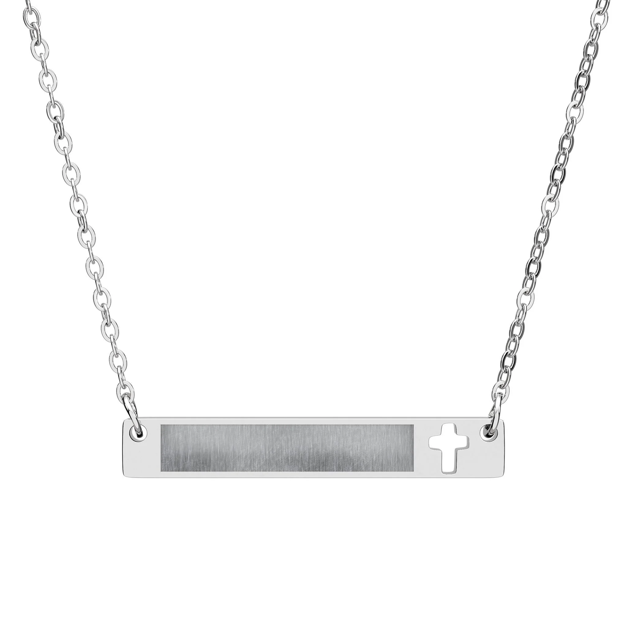 Add a touch of bold elegance to your jewelry collection with this Cutout Cross Bar Stainless Steel Necklace. Designed with a modern cutout cross on a sleek bar, this necklace combines contemporary style with timeless appeal. Crafted from a durable stainless steel, the pendant offers a polished, high-quality finish that resists tarnishing and corrosion, ensuring long-lasting wear. The sleek bar makes it perfect for engraving a name, date, or small message!