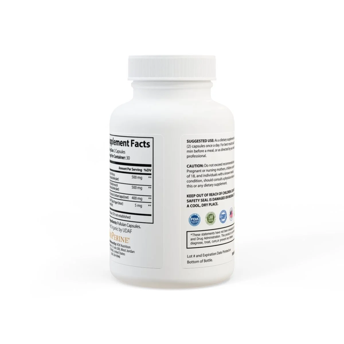 Ingredients: Organic Irish Moss (Chondrus crispus)(whole plant), Organic Burdock (Arctium lappa)(root), Organic Bladderwrack (Fucus vesiculosus)(whole plant), BioPerine® (Black Pepper Extract), (Piper nigrum)(fruit). Other Ingredients: Pullulan Capsules.
