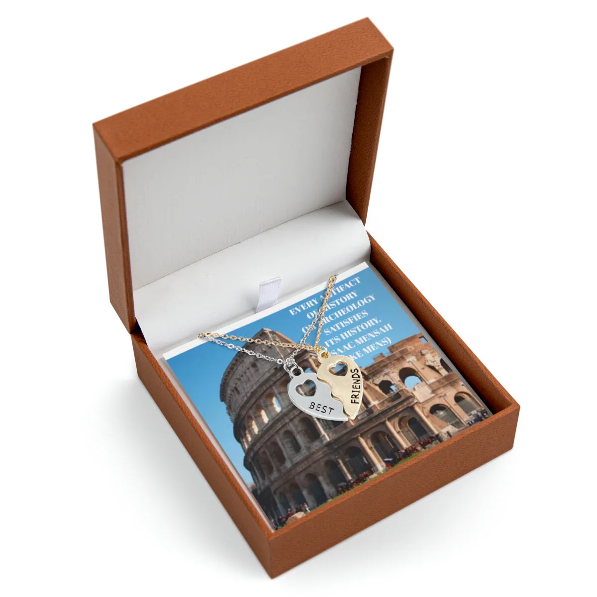 Made to rejoice in friendship, these stainless steel and 18K gold-plated pendants are as durable as a great friendship. The pendants are tarnish-resistant and feature a 17.7"-21.7" adjustable chain made of stainless steel with a lobster clasp attachment. Add a message in the customizable message card (front and back print available) and choose between 3 beautiful box options for a stunning presentation: LED, Textured Magnetic, or Brown PU Leather boxes.