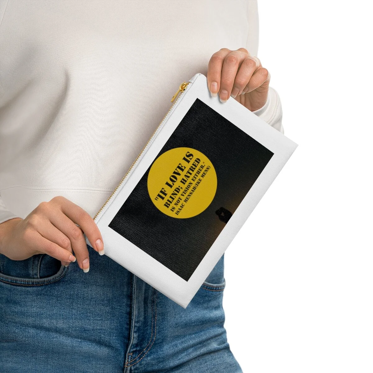 Made with 100% cotton canvas, this cosmetic bag brings out the chic in your style. Coming in at 9.5” by 7” size, it features a gold color zipper along with a lined interior for both added fashion points as well as durability. Add your own design and travel with all your supplies or valuables stylishly organized. .: Material: 100% cotton canvas .: One size: 7" x 9.5" (17.7cm x 24.13cm) .: Weight: 10oz (280g) .: One-sided print .: White lining .: Gold color zipper