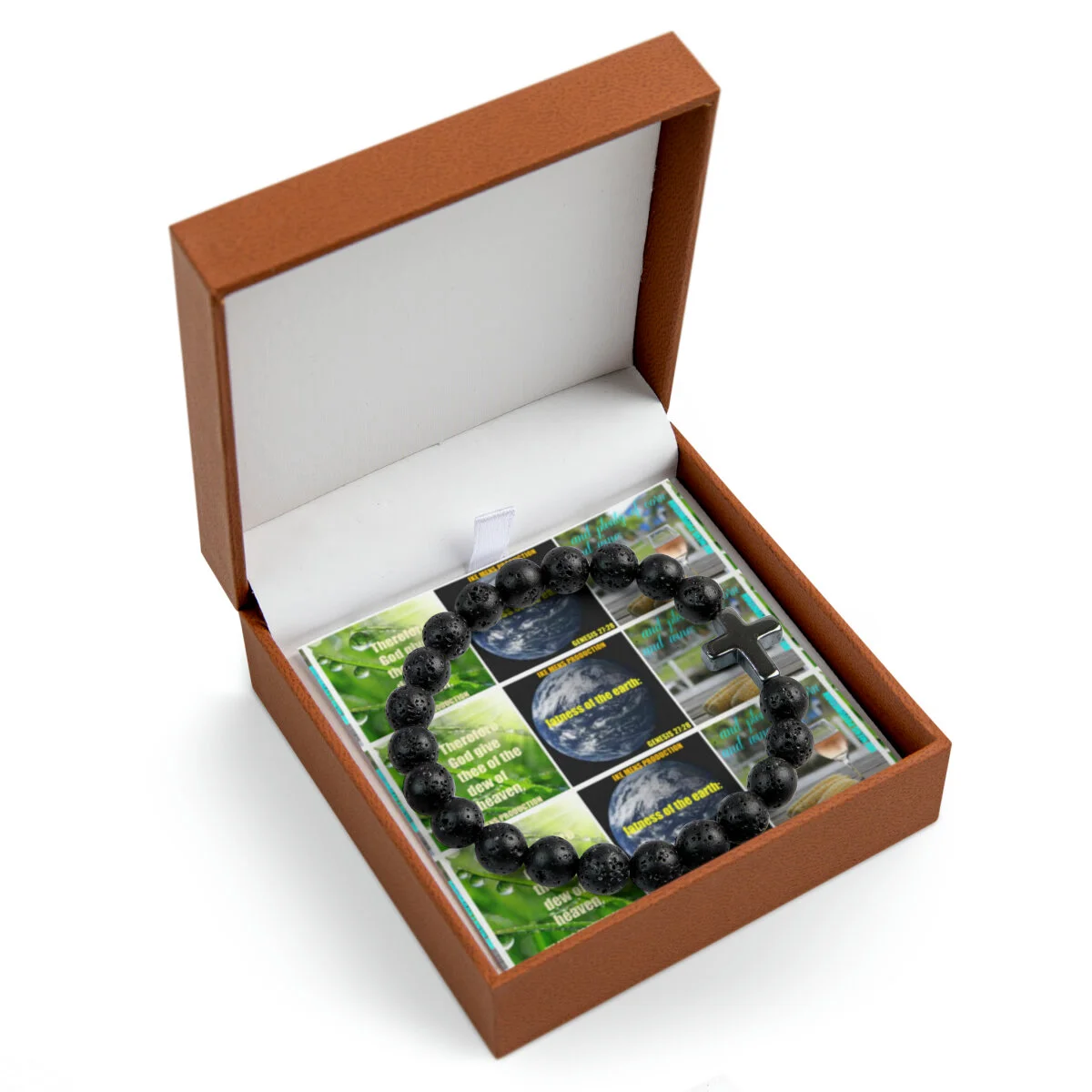 Created for the perfect gifting experience, this cross bead bracelet comes in one size featuring a 14mm by 17mm magnetite stone charm surrounded by 8mm volcanic beads. Each custom bead bracelet comes with a customizable message card (front and back print available) and has 3 beautiful gift box options: LED, Textured Magnetic or Brown PU Leather.