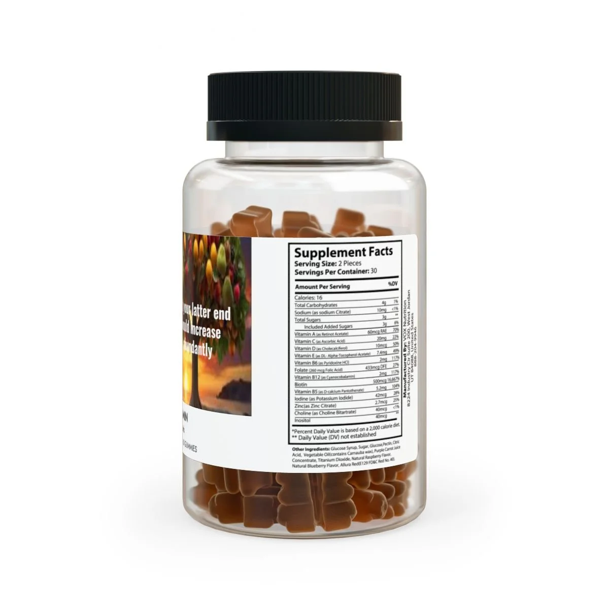 Ingredients: Vitamin A (as Retinot Acetate), Vitamin C (as Ascorbic Acid), Vitamin D (as Cholecalciferol), Vitamin E (as DL- Alpha-Tocopherol-Acetate), Vitamin B6 (as Pyridoxine HCl), Folate (260 mcg Folic Acid), Vitamin B12 (as Cyanocobalamin), Biotin, Vitamin B5 (as D-calcium Pantothenate), Iodine (as Potassium Iodide), Zinc(as Zinc Citrate), Choline (as Choline Bitartrate), Inositol. Other Ingredients: Glucose Syrup, Sugar, Glucose,Pectin, Citric Acid, Vegetable Oil(contains Carnauba wax), Purple Carrot Juice Concentrate, Titanium Dioxide, Natural Raspberry Flavor, Natural Blueberry Flavor, Allura Red(E129 FD&C Red No. 40).