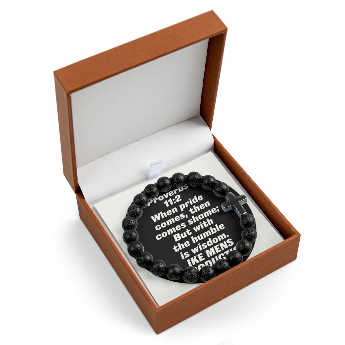 Created for the perfect gifting experience, this cross bead bracelet comes in one size featuring a 14mm by 17mm magnetite stone charm surrounded by 8mm volcanic beads. Each custom bead bracelet comes with a customizable message card (front and back print available) and has 3 beautiful gift box options: LED, Textured Magnetic or Brown PU Leather.